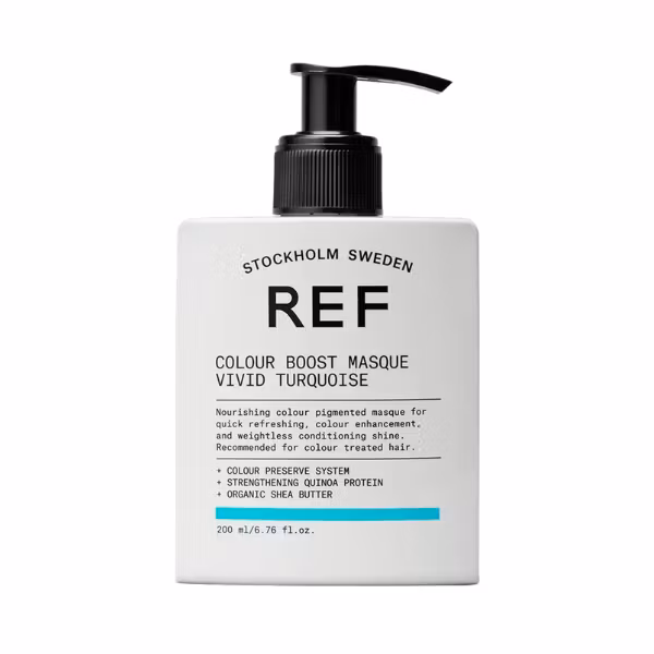 REF Colour Boost Vivid Turquoise är framtagen för att bevara och förstärka intensiteten i turkosa nyanser. Den pigmentrika formulan med klara färgpigment och vårdande botaniska ingredienser fräschar upp färgen samtidigt som håret återfuktas och stärks. Resultatet är ett mjukt, följsamt hår med en intensiv, klar och långvarig turkos färg som ser frisk och levande ut.