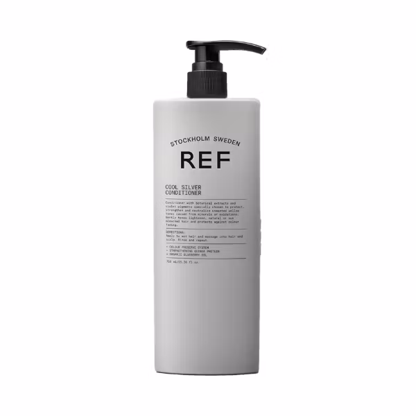 REF Cool Silver Conditioner neutraliserar varma gula toner och förstärker kalla blond-, grå- och silvernyanser. Formulan är berikad med lila pigment och ekologiskt blåbärsextrakt, vilket ger djupt vårdat hår med mjukt, glänsande och iskallt skimrande resultat.För bästa effekt, använd tillsammans med REF Cool Silver Shampoo för långvarig färgintensitet och perfekt tonad finish.