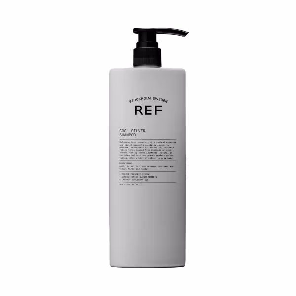 Neutralisera oönskade gula toner med REF Cool Silver Shampoo, Den perfekta lösning för blont, grått eller silverfärgat hår. Det tonande schampot är berikat med ekologiskt blåbärsextrakt och violetta toner som effektivt dämpar varma, gula nyanser samtidigt som de lyfter fram svala, klara färgtoner. Den skonsamma rengörande formulan hjälper till att bevara hårets styrka och följsamhet och ger ett intensivt, livfullt färgresultat. Passar både naturligt och blekt blont hår som vill ha en ljusare, mer tonad finish utan att håret känns torrt.