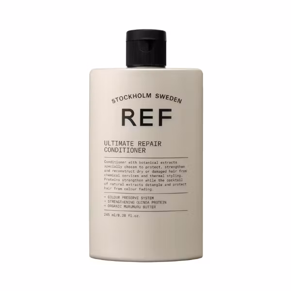 REF Ultimate Repair Conditioner är ett djupverkande balsam som bygger upp och stärker skadat hår. Med quinoaprotein och vårdande botaniska extrakt, såsom murumurusmör, återfuktar det intensivt, förbättrar elasticiteten och minskar kluvna toppar utan att tynga ner håret. Resultatet blir starkare, glansigare och mer motståndskraftigt hår. Passar även lockigt hår och är perfekt efter färgbehandling eller som daglig vård för stressat och skadat hår.