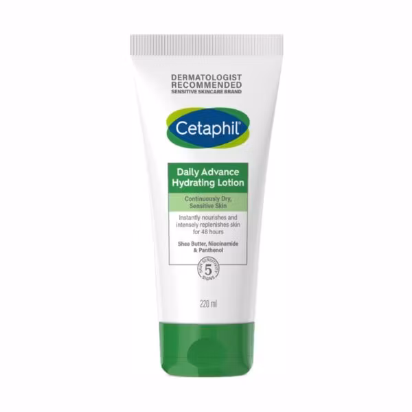 Cetaphil Daily Advance Hydrating Lotion är en närande lotion för ansikte och kropp. Lotionen innehåller nio fuktgivande ingredienser, bland annat sheasmör, E-vitamin, niacinamid och pantenol, och har i kliniska tester visat sig kapsla in och bevara fukten i huden, och skydda huden mot uttorkning i 48 timmar.