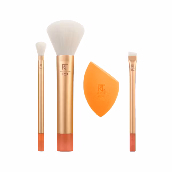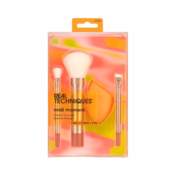 Real Techniques Midi Moment Brush + Sponge Set innehåller 3 medelstora borstar och en Miracle Complexion Sponge för hela ansiktet.